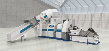 The universal-use recycling line for processing all types of films, fibres, fleece, monofilaments, multifilaments, tapes, and fabrics as well as for massive lump waste and large moulded parts. This versatile line can process all thermoplastics, for example PE, PP, PS, PA, and others. It is used especially for hard-to-grind materials and products.
