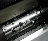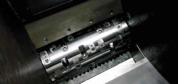 The material is fed without pre-cutting to the single-shaft cutter by conveyor belt, film reel feeder or edge trim cyclone. A hydraulically driven pusher presses the material against the rotor, where it is cut between the rotary and stationary knives. The rotary shaft is cooled to facilitate the cutting of materials with low melting points. However, cooling is kept to the necessary minimum so that the energy generated in cutting can be utilised in the extrusion process.